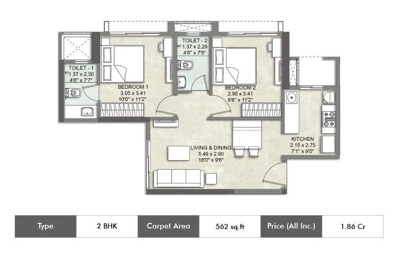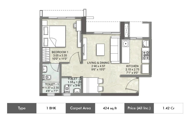 3 BHK 1375 sqft (Carpet Area) 3.14 Cr* Onwards*